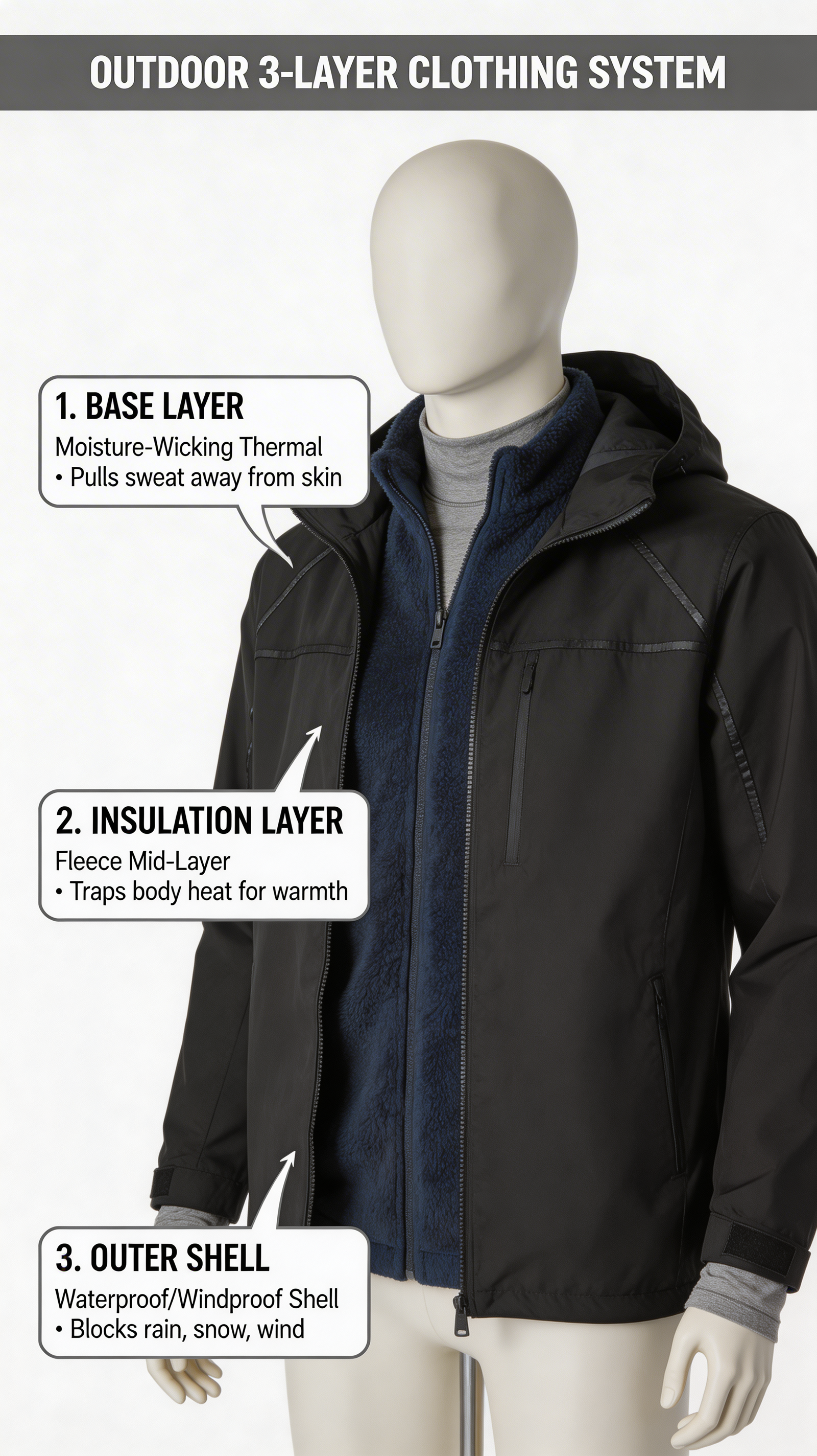 The three-layer system was created because no single piece could do it all. Brands couldn't engineer a fabric that wicked, insulated, and protected at the same time.