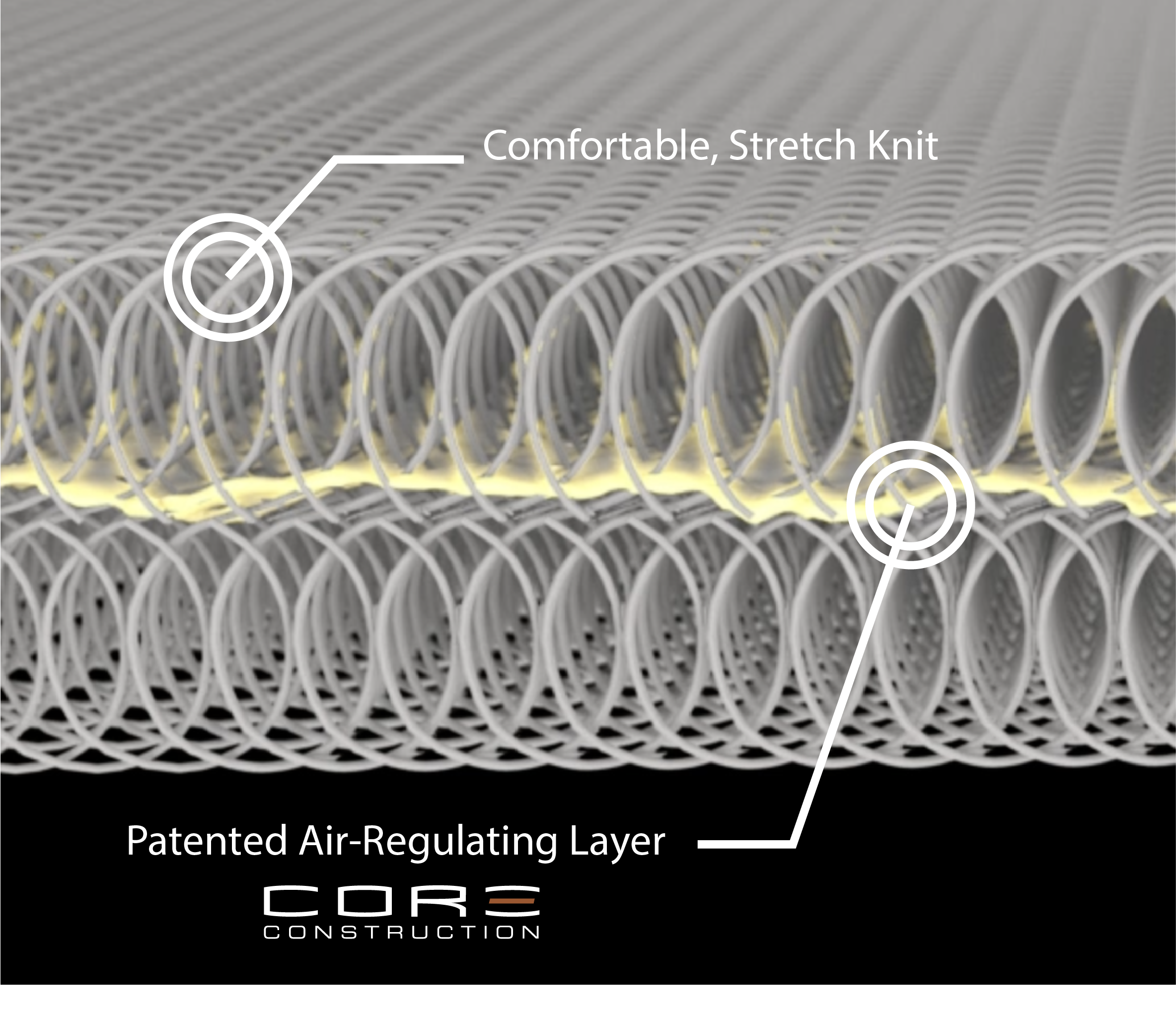 Instead of building three separate layers, CORE CONSTRUCTION® integrates protection directly into the textile itself during the knitting process. We call it structural textile architecture – building engineered performance into the fabric, not layering it on top.
